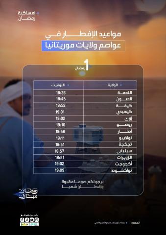 تتراوح أوقات الإفطار اليوم الخميس فاتح شهر رمضان المبارك 1447 هجرية، في عواصم الولايات الموريتانية ما بين 18:36 دقيقة في مدينة النعمة عاصمة ولاية الحوض الشرقي، و19:11 دقيقة في مدينة نواذيبو عاصمة البلاد الاقتصادية.
