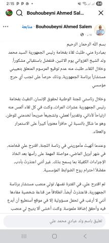 شرح ألأستاذ أحمد سالم ولد بوحبيني ملابسات اعتذاره عن قبول تعيينه، معربا عن شكره لفخامة رئيس الجمهورية محمد ولد الشيخ الغزواني، مبرزا أنه :" خرج من كل لقاء بانطباع إيجابي متجدد؛ معجباً بأخلاقه، وهدوئه في معالجة القضاي