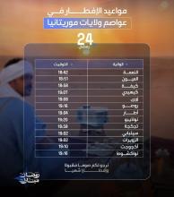 تتراوح أوقات الإفطار اليوم الأحد الـ25 من أيام شهر رمضان المبارك 1447 هجرية، في عواصم الولايات الموريتانية ما بين 18:42 دقيقة في مدينة النعمة عاصمة ولاية الحوض الشرقي، و19:21 دقيقة في مدينة نواذيبو عاصمة البلاد الاقتصاد
